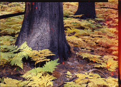 Although I had never experienced any problems with monochrome films, light flares appeared sporadically on color transparencies over time. At first, this was almost certainly caused by the commercial lab that developed the film, as I don't develop color myself. But the lab in question (one of the few remaining labs willing to develop large format color film) placed the blame on lens/camera flare or bellows leaks. After performing light leak tests and inspecting the camera lenses and film holders several times over a period of more than a year, nothing was found to indicate the camera was at fault. I had even taken simultaneous shots using monochrome and color films (i.e., Fuji Provia, Kodak Ektachrome) in the same film holder, resulting in a perfect negative and a light damaged transparency. I finally sent the camera to Keith Canham (Canham Cameras) for his help. It was returned with a clean bill of health.